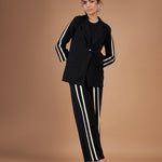Black Contrast Tape Blazer With Straight Pants, in Karera Knit fabric, Unlined, Regular Length, Regular Fit, Button Closure, Straight Hemline and features Fancy Button Detail/ Contrast Tape Detail At Front
