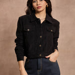 Black Courduroy Full Sleeve Jacket , in Corduroy fabric, Poly knit, Regular Length, Comfort Fit, Button Closure, Straight Hemline and features Button Detail At Front