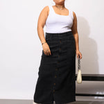 Black Denim Acid Wash Front Button Skirt, in Denim fabric, Unlined, Midi Length, Comfort Fit, Button Closure, Straight Hemline and features