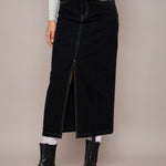 Light Blue Denim Box Pocket Front Slit Midi Skirt, in Denim fabric, Unlined , Below Knee, Comfort Fit, Button Closure, Straight Hemline and features Slit At Front