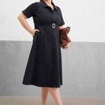 Women Black Denim Front Zipper Flared Hem Midi Dress