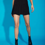 Black Denim Premium Front Pleated Skorts, in Denim fabric, Unlined, Thigh Length, Comfort Fit, Button Closure, Straight Hemline and features Pleated Detail At Front
