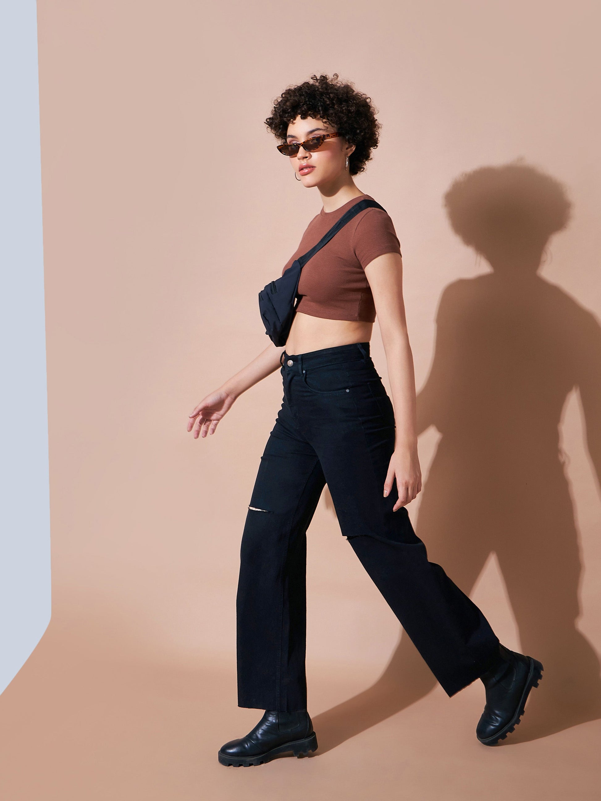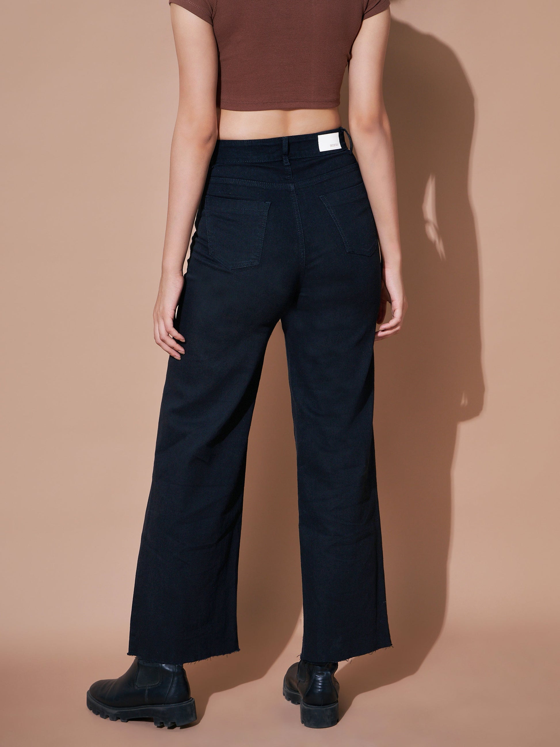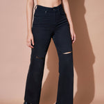 Black Denim Premium Knee Slit Straight Jeans, in Denim fabric, Unlined, Full Length, Straight Fit, Button Closure, Straight Hemline and features Scissor Cut Detail At Knee