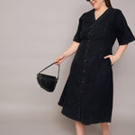 Black Denim V Neck Midi Dress, in Denim Lycra fabric, Unlined, Midi Length, Fit & Flare, Button Closure, Flared Hemline and features Pockets Detail At Side