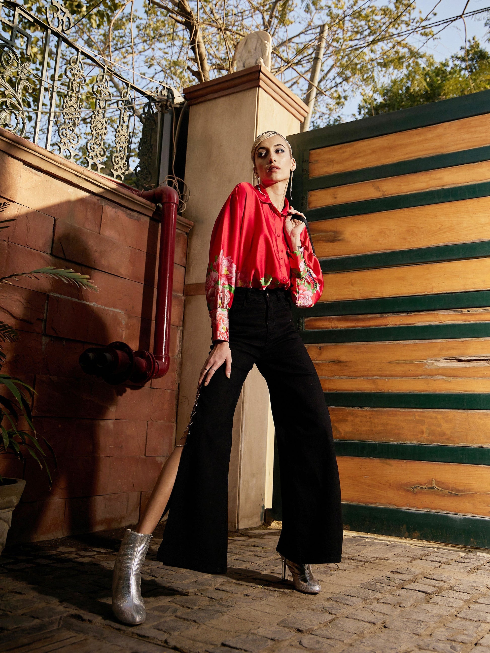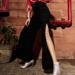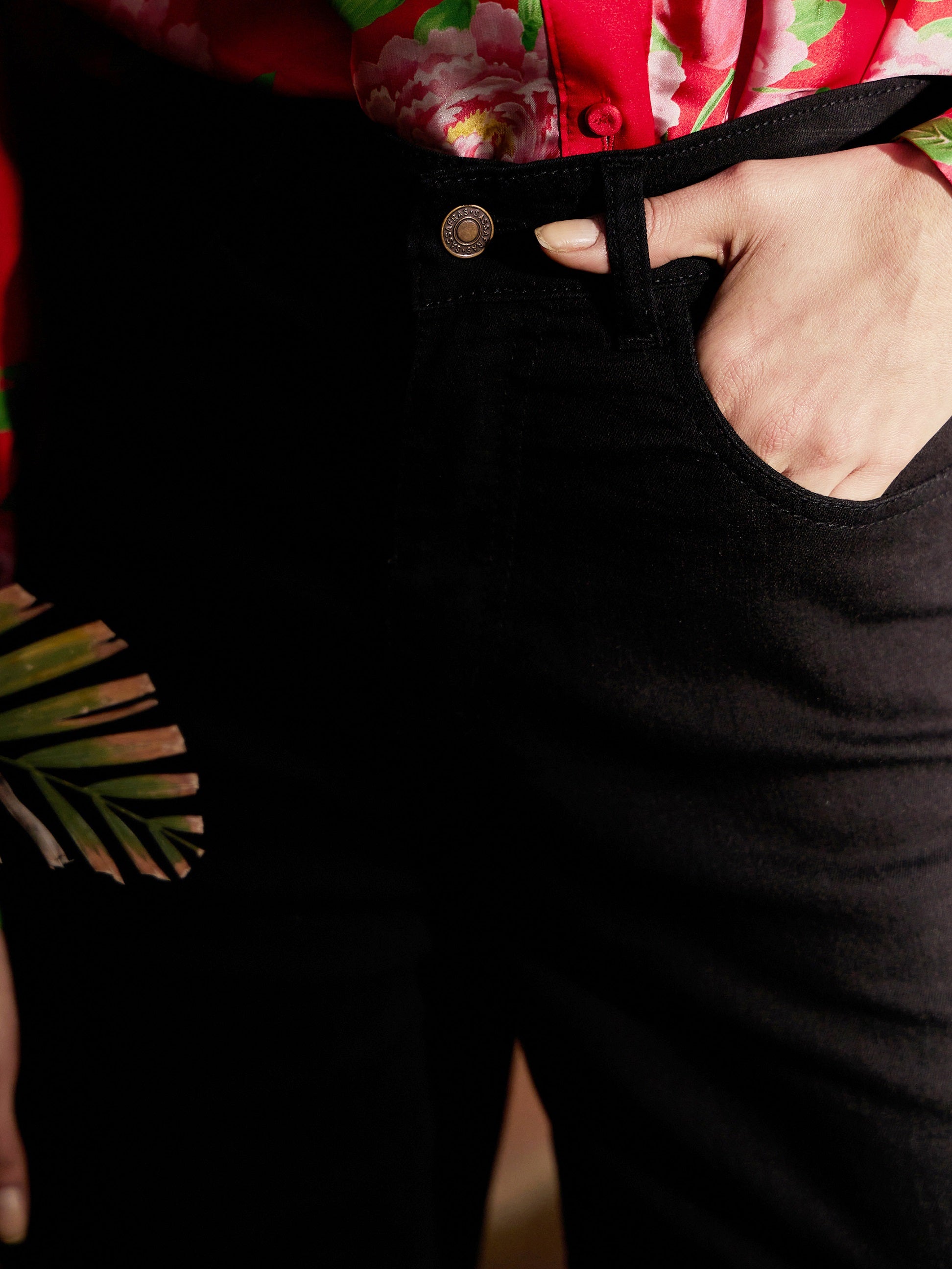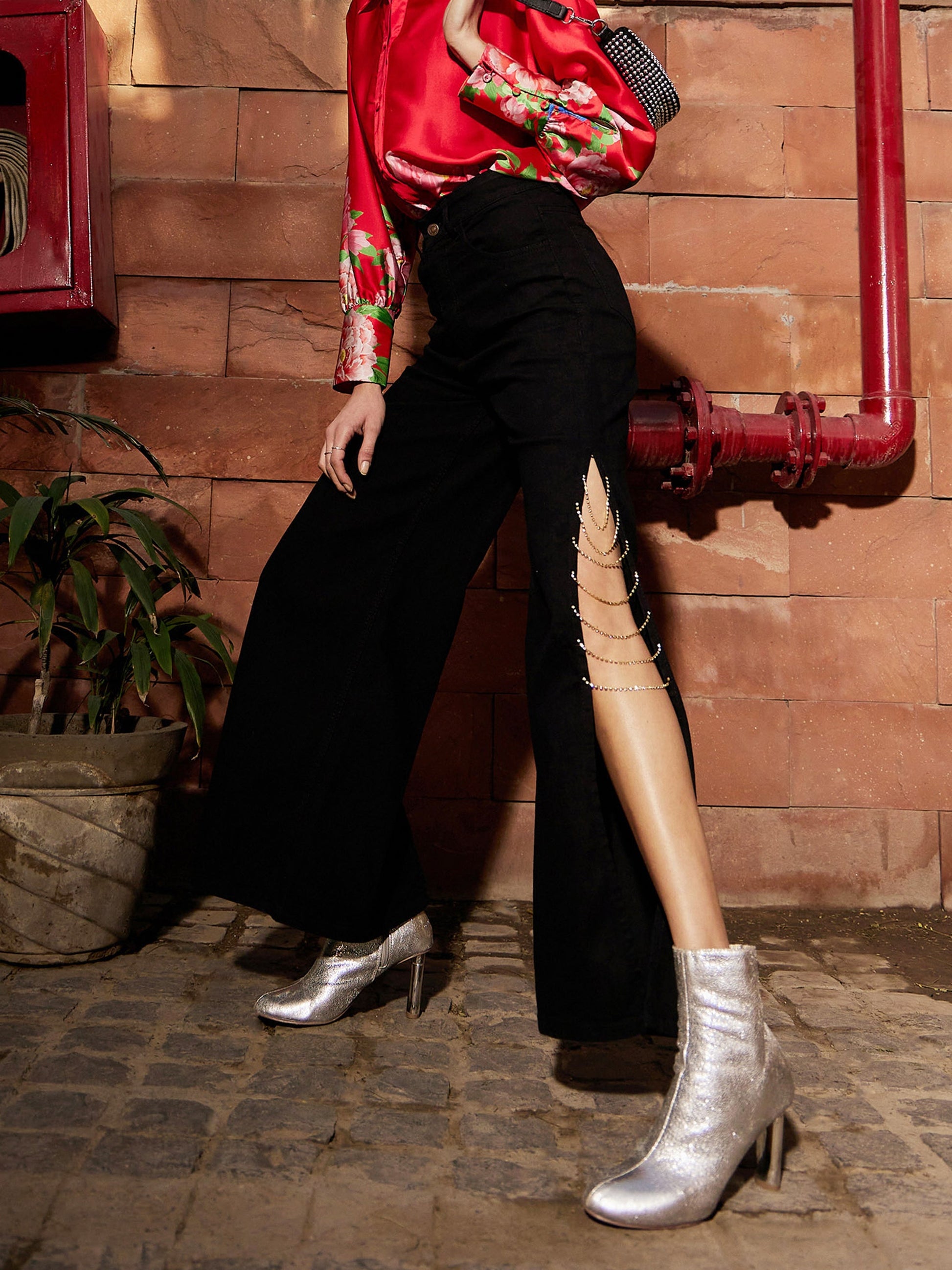 Black Diamante Side Slit Straight Jeans, in Denim fabric, Unlined, Full Length, Regular Fit, Button Closure, Straight Hemline and features Diamante Chain Detail At Side Slit