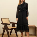 Black Dobby Puff Sleeve Midi Dress, in Swiss Dobby fabric, Polyknit Lining, Below Knee, Fit & Flare, Button Closure, Flared Hemline and features Ruffle Detail At Collar
