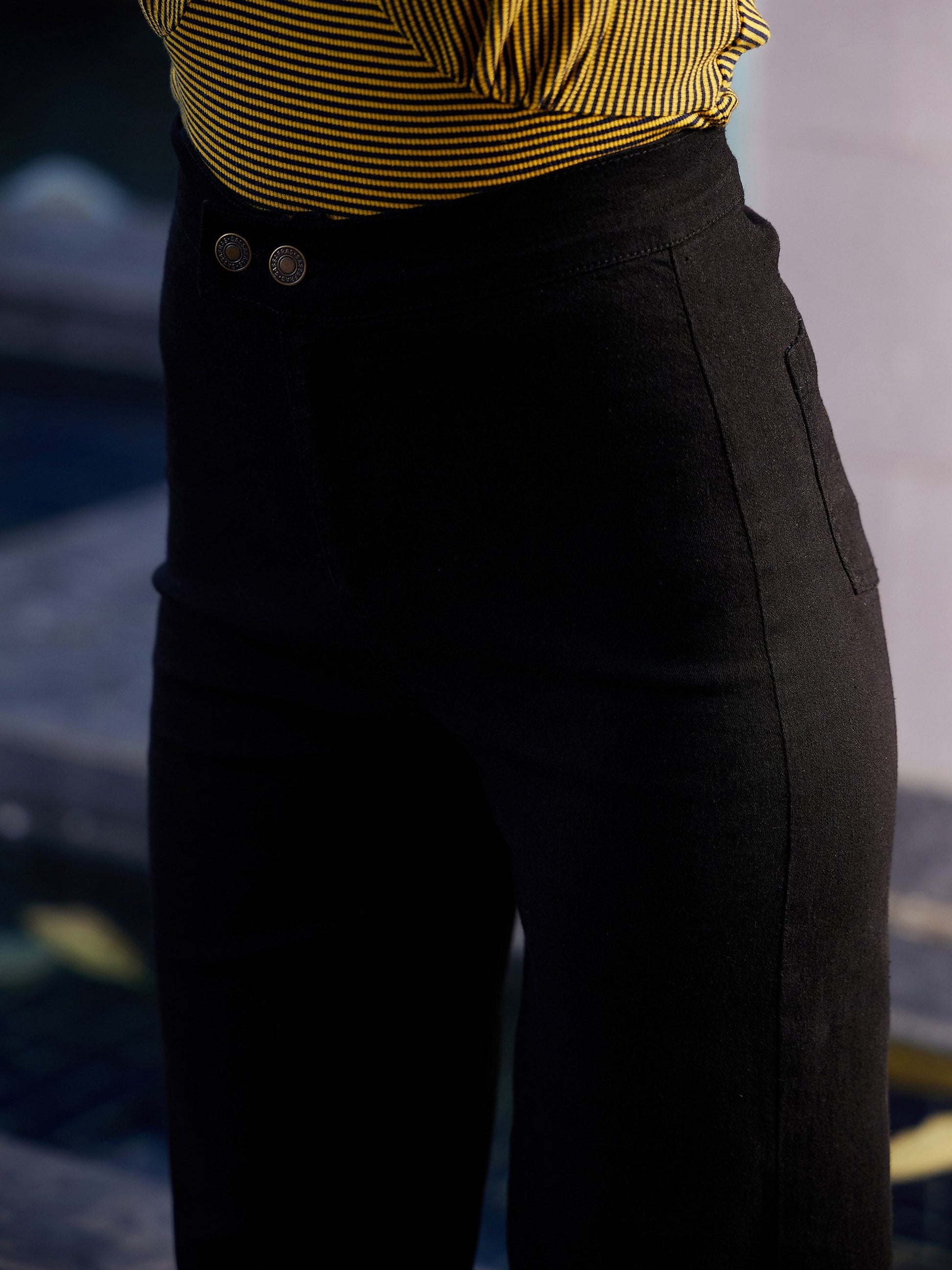 Black Double Button Straight Premium Jeans, in Denim fabric, Unlined, Full Length, Comfort Fit, Button Closure, Straight Hemline and features Double Button Detail At Waist