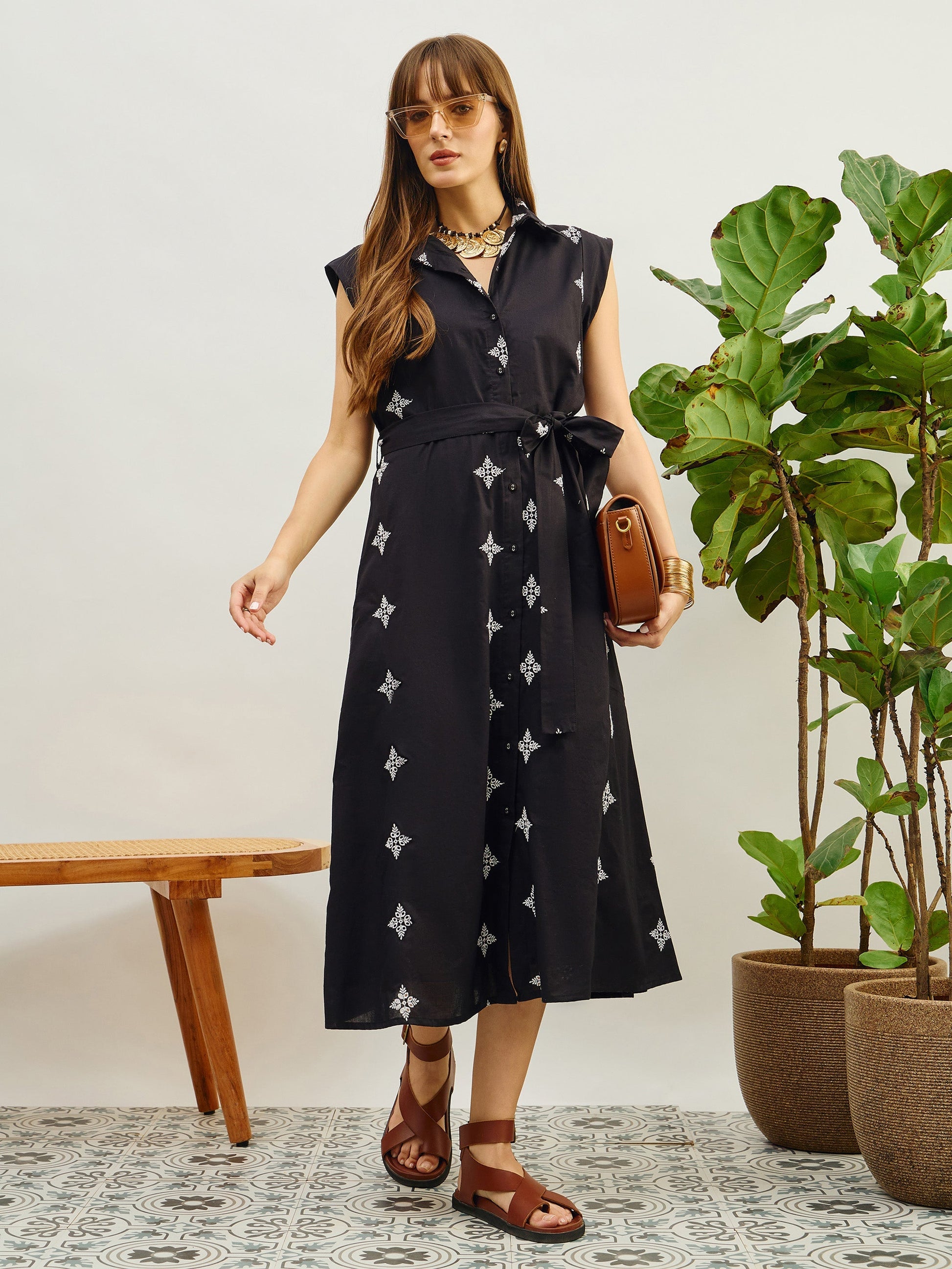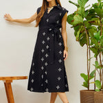 Black Embroidered Button Down Midi Dress, in Cotton Cambric fabric, Cotton Voile Lining, Below Knee, Regular Fit, Button Closure, Straight Hemline and features Belt At Waist