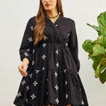 Black Embroidered Shawl Collar Tiered Dress, in Cotton Cambric fabric, Unlined, Knee Length, Fit & Flare, No Closure, Flared Hemline and features Wrap Detail At Front