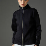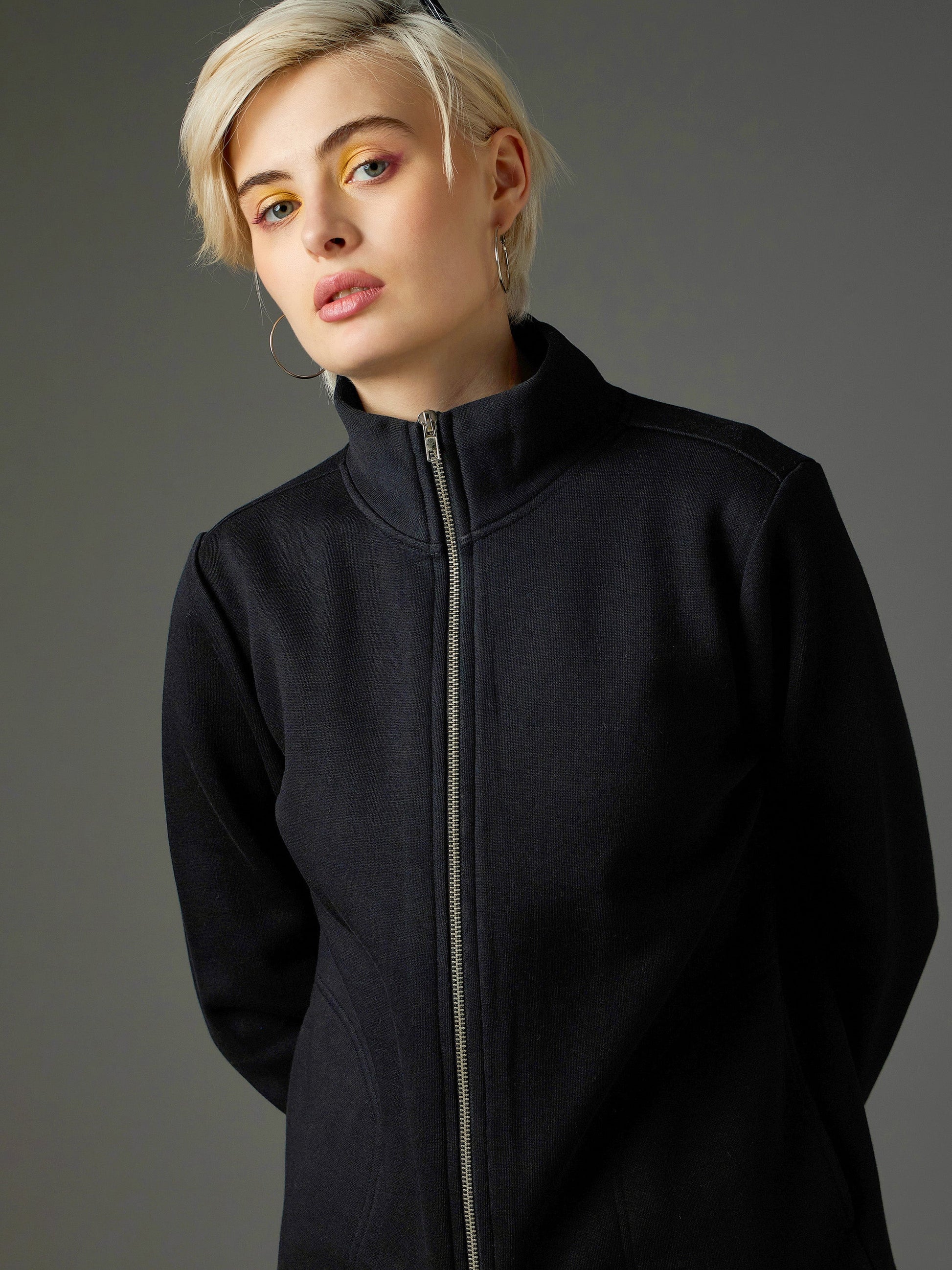 Black Fleece Front Zipper Jacket, in Fleece fabric, Unlined, Regular Length, Regular Fit, Zipper Closure, Straight Hemline and features Inlay Pockets At Side