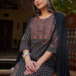 Women Black Floral Front Yoke Kurta With Pencil Pants & Dupatta