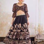 Women Black Floral Hem Frill Crop Top With Anarkali Skirt