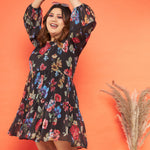 Black Floral Raglan Sleeves Tiered Dress, in Chiffon fabric, Polyester Lining, Knee Length, Comfort Fit, Button Closure, Flared Hemline and features Tiered Flared Bottom