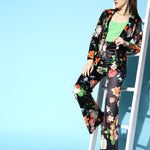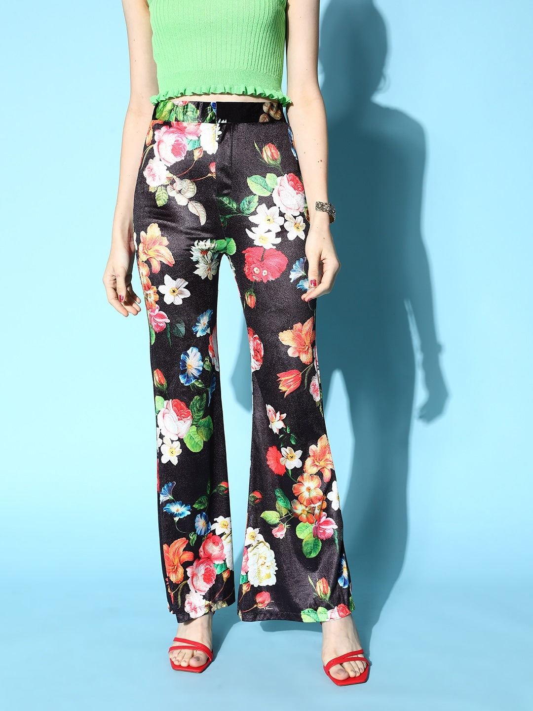 Black Floral Velvet Bell Bottom Pants, in Velvet fabric, Unlined, Full Length, Comfort Fit, Button Closure, Straight Hemline and features All Over Print Bell Bottoms