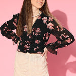 Black Floral Wrap Peplum Top, in Georgette fabric, Polyester, Regular Length , Comfort Fit, Eye- Hook, Straight Hemline and features Wrap Detail At Front