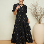 Women Black Foil Print Puff Sleeves Tiered Maxi Dress