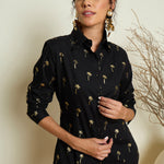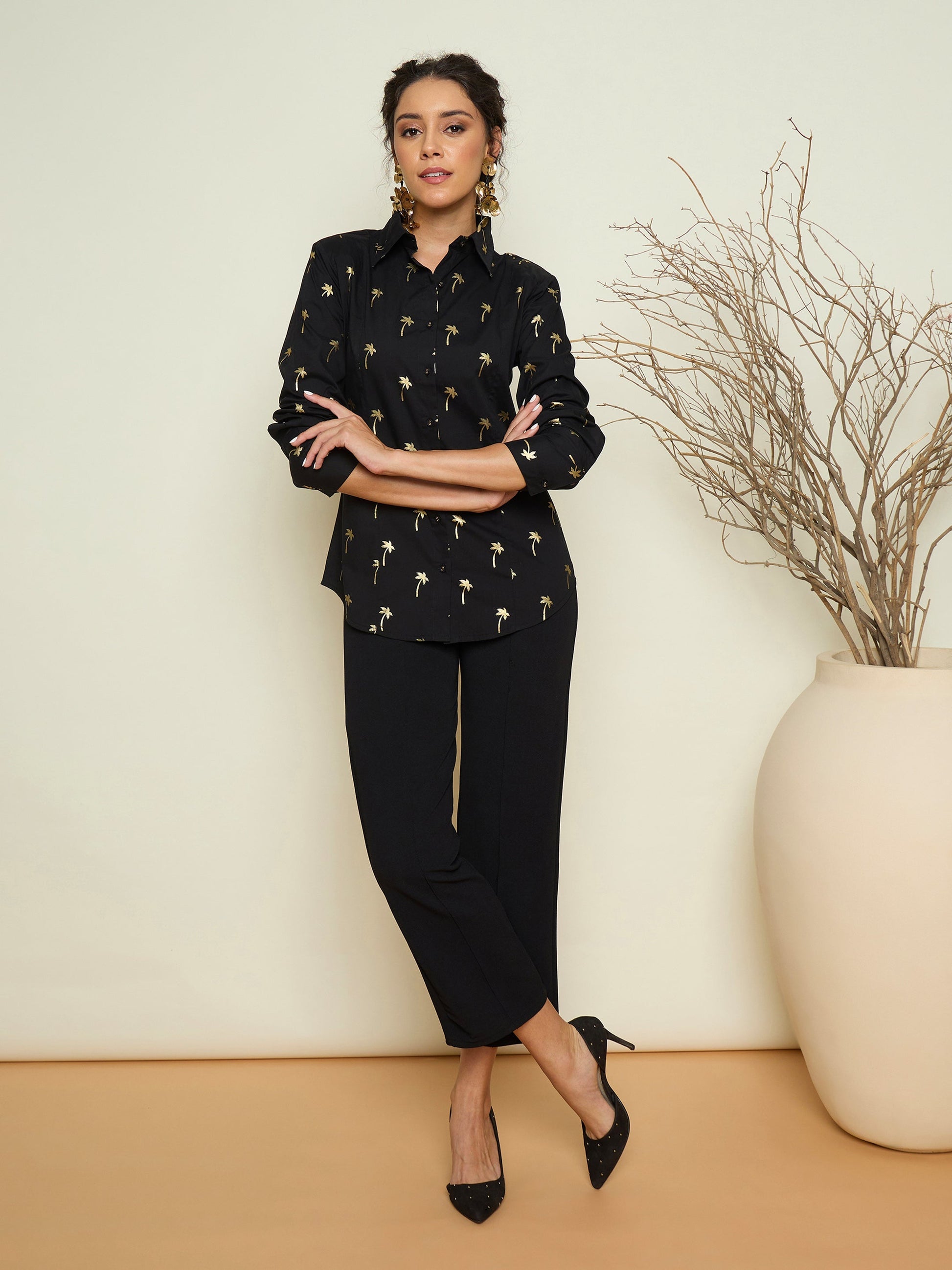 Women Black Foil Print Shoulder Padded Slim Fit Poplin Shirt