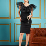 Black Frill Neck Bodycon Midi Dress, in Karera Knit fabric, Unlined, Below Knee, Bodycon, Zipper Closure, Straight Hemline and features Frill Detail At Neck