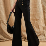 Black Front Button Flared Bell Bottom Pants, in Roma fabric, Unlined, Full Length, Fit & Flare , NA, Flared Hemline and features Golden Button Detail At Front