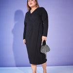 Black Front Wrap Bodycon Midi Dress, in Karera Knit fabric, Unlined, Midi Length, Body Con Fit, No Closure, Straight Hemline and features Smoking Detail At Bodice
