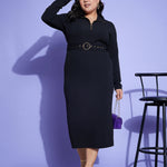 Black Front Zipper Belt Dress, in Karera Knit fabric, Unlined, Midi Length, Straight Fit, Zipper Closure, Straight Hemline and features Belt Detail