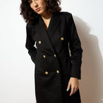 Black Full Sleeves Double Breasted Blazer Dress, in Cotton Twill Lycra fabric, Polyknit, Above Knee, Comfort Fit, Button Closure, Straight Hemline and features Golden Button Detail At Front