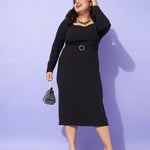Black Glitter Side Slit Belted Midi Dress, in Glitter Karera fabric, Unlined, Knee Length, Slim Fit, Zipper Closure, Straight Hemline and features Mock Belt Detail At Waist
