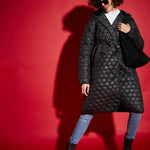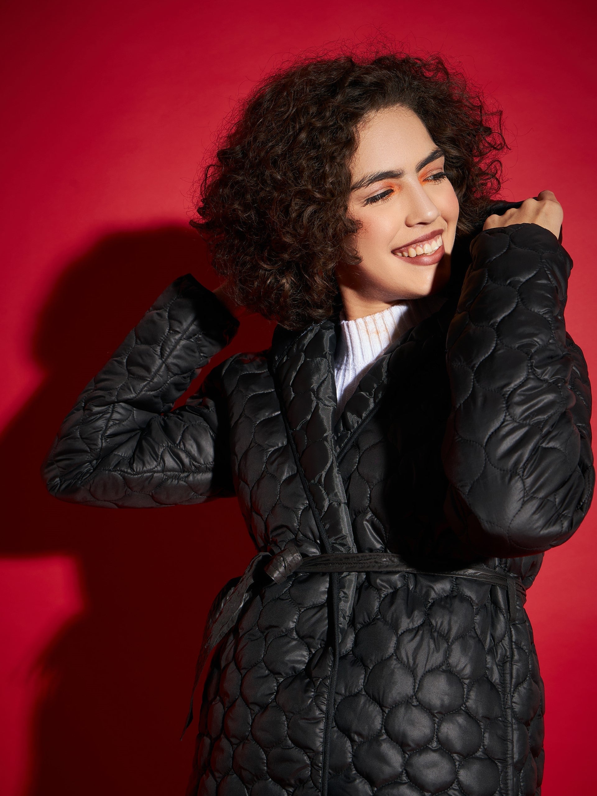 Black Hooded Longline Puffer Jacket, in Taffeta fabric, Polyester, Longline, Comfort Fit, No Closure, Straight Hemline and features Belt Detail At Waist