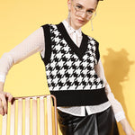 Women Black Houndstooth V-Neck Sleeveless Sweater