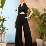 Black Knitted Halter Neck Jumpsuit, in Karera Knit fabric, Unlined, Full Length, Regular Fit, No Closure, Straight Hemline and features Elastic At Waist