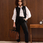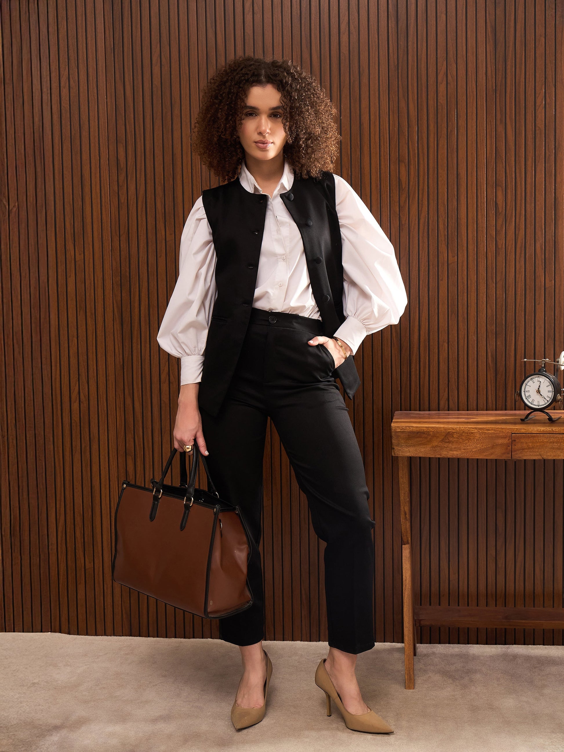 Black Longline Top With Pants, in Cotton Twill Lycra fabric, Unlined, Regular Length/Ankle Length, Comfort Fit, Button Closure /Button & Zipper Closure, Straight Hemline and features Button Detail At Front