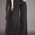 Black Low Waist Wide Leg Jeans , in Denim fabric, Unlined, Full Length, Straight Fit, Button Closure, Straight Hemline and features Wide Leg Pattern