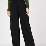 Black Multi Pocket Detail Cargo Pants, in Canton Knit fabric, Unlined, Full Length, Comfort Fit, Button Closure, Straight Hemline and features Multi Pocket Detail