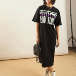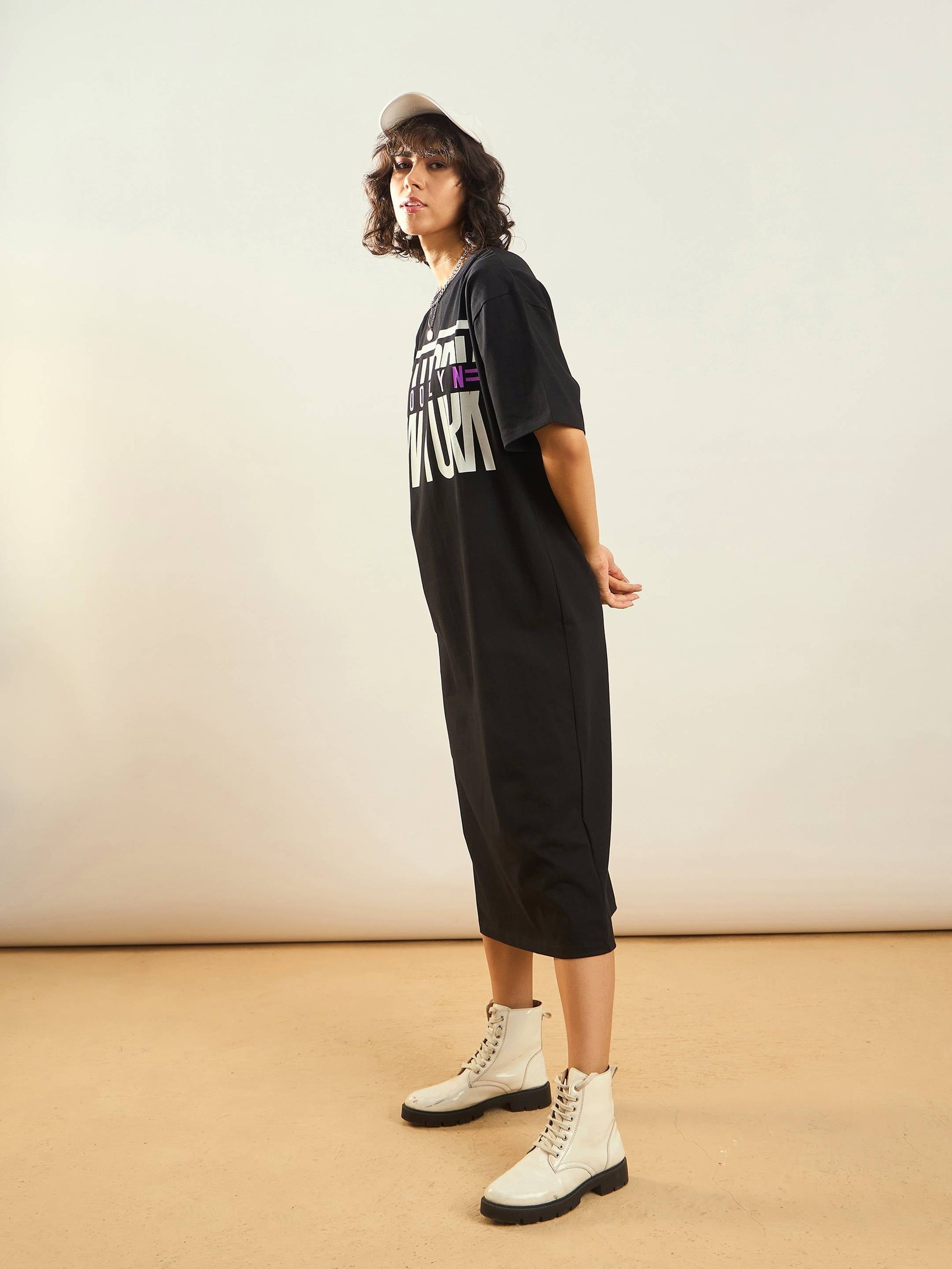 Black NEW YORK Printed T-Shirt Dress, in Cotton Jersey fabric, Unlined , Below Knee, Oversized, No Closure, Straight Hemline and features Print Detail At Front