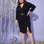 Black Notch Collar Belted Bodycon Dress, in Karera Crepe fabric, Unlined, Midi Length, Body Con Fit, Zipper Closure, Straight Hemline and features Diamante Belted Detail At Waist