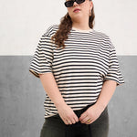 Black & Off White Stripe Round Neck T-Shirt, in Cotton Lycra fabric, Unlined, Regular Length, Comfort Fit, No Closure, Straight Hemline and features Rib Detail At Neck