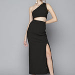 Black One Shoulder Maxi Dress, in Karera fabric, Unlined, Maxi Length, Slim Fit , No Closure, Straight Hemline and features One Side Cut Out Detail At Waist