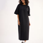 Black Oversized T-Shirt Dress, in Cotton Jersey fabric, Unlined , Midi Length, Oversized Fit, No Closure, Straight Hemline and features Ribbed Neck Detail
