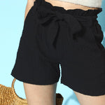Black PaperBag Waist Belted Shorts, in Bubble Crepe fabric, Unlined, Above Knee, Comfort Fit, Elasticated Waistline, Straight Hemline and features Self Fabric Belt At Waist