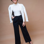 Black Pleated Straight Stretchable Pants , in Canton Knit fabric, Unlined, Full Length, Comfort Fit, Button Closure, Straight Hemline and features Pleats Detail At Front