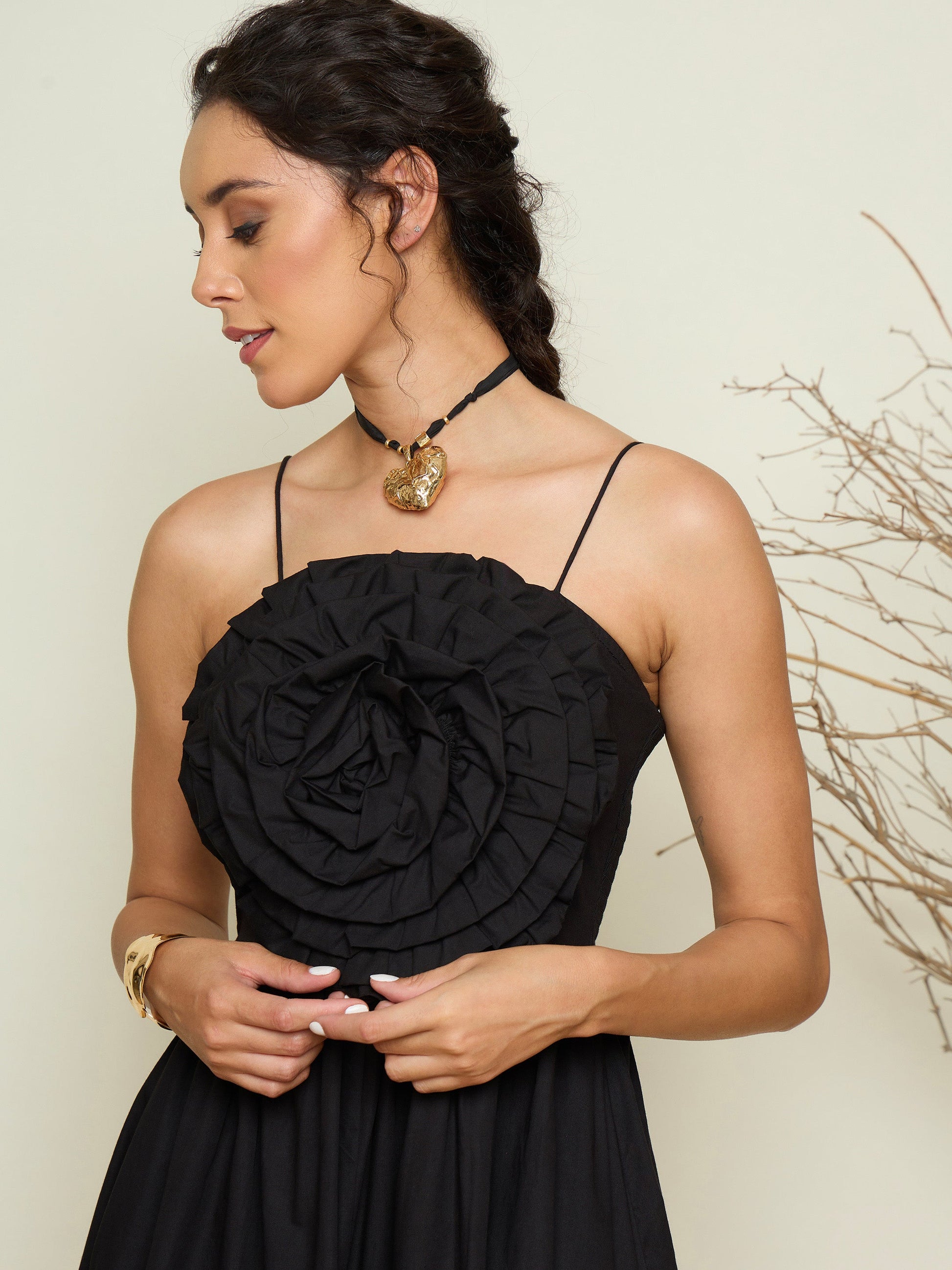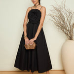 Women Black Poplin Front Corsage Strappy Maxi Dress