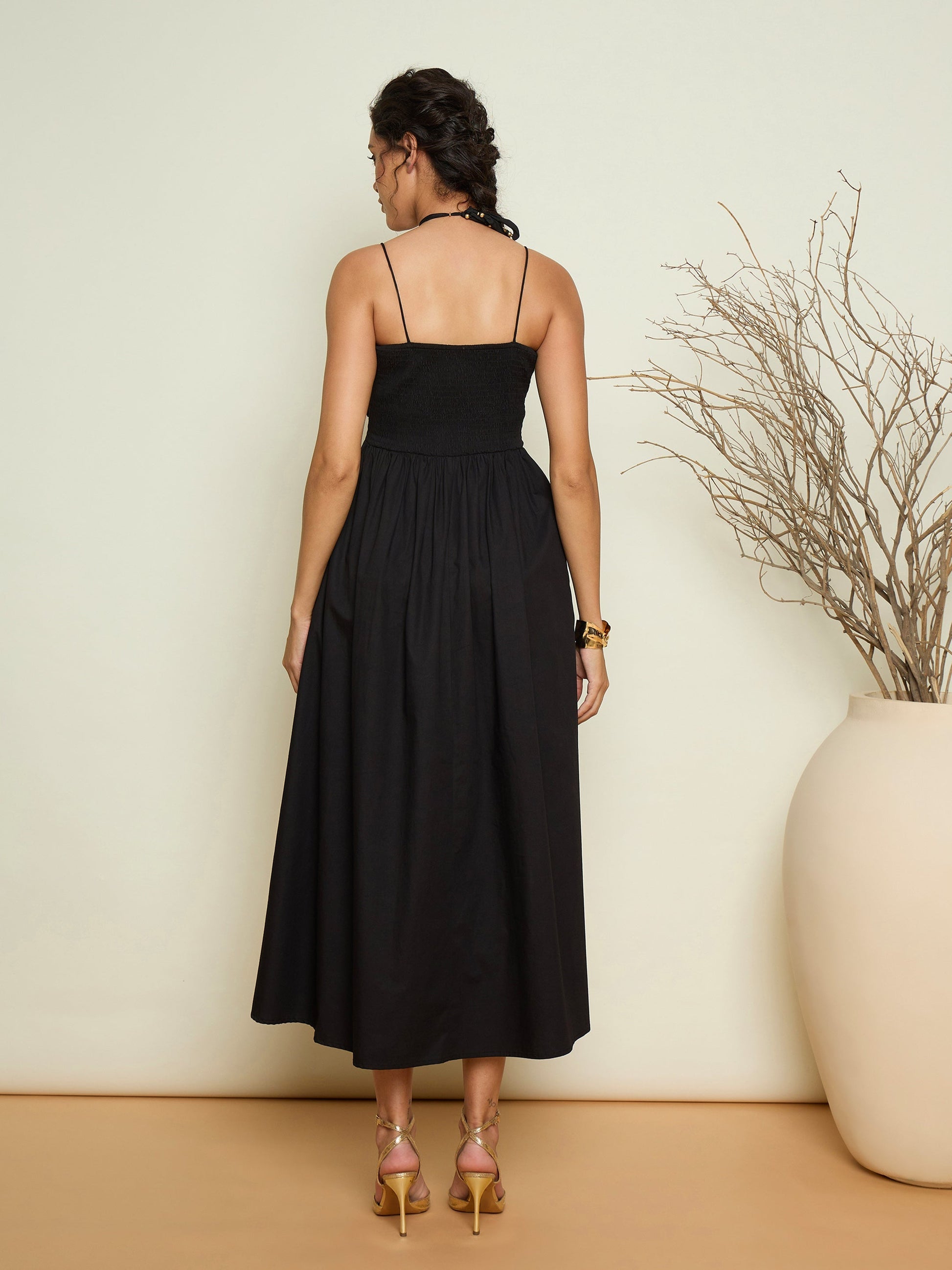 Black Poplin Front Corsage Strappy Maxi Dress, in Cotton Poplin fabric, Unlined, Maxi Length, Fit & Flared, No Closure , Flared Hemline and features Corsage Detail At Front