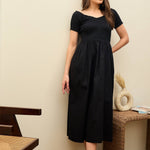 Black Poplin Smocked Midi Dress, in Poplin fabric, Unlined, Below Knee, Fit & Flare, NA, Flared Hemline and features Smocking At Chest