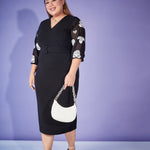 Black Printed Balloon Sleeve Belted Bodycon Dress, in Karera Knit fabric, Unlined, Midi Length, Body Con Fit, Zipper Closure, Straight Hemline and features Self Fabric Ring Belt