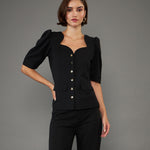 Black Puff Sleeves Top, in Canton Knit fabric, Unlined, Regular Length, Regular Fit , Button Closure, Straight Hemline and features