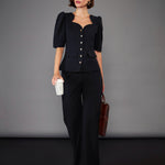 Black Puff Sleeves Top With Bell Bottom Pants, in Canton Knit fabric, Unlined, Regular Length, Regular Fit , Button Closure, Straight Hemline and features Show Pocket Detail/Flared Leg Pants