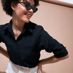 Black Relaxed Fit Shirt, in Seersucker fabric, Unlined, Regular Length, Regular Fit, Button Closure, Curved Hemline and features Seersucker Fabric