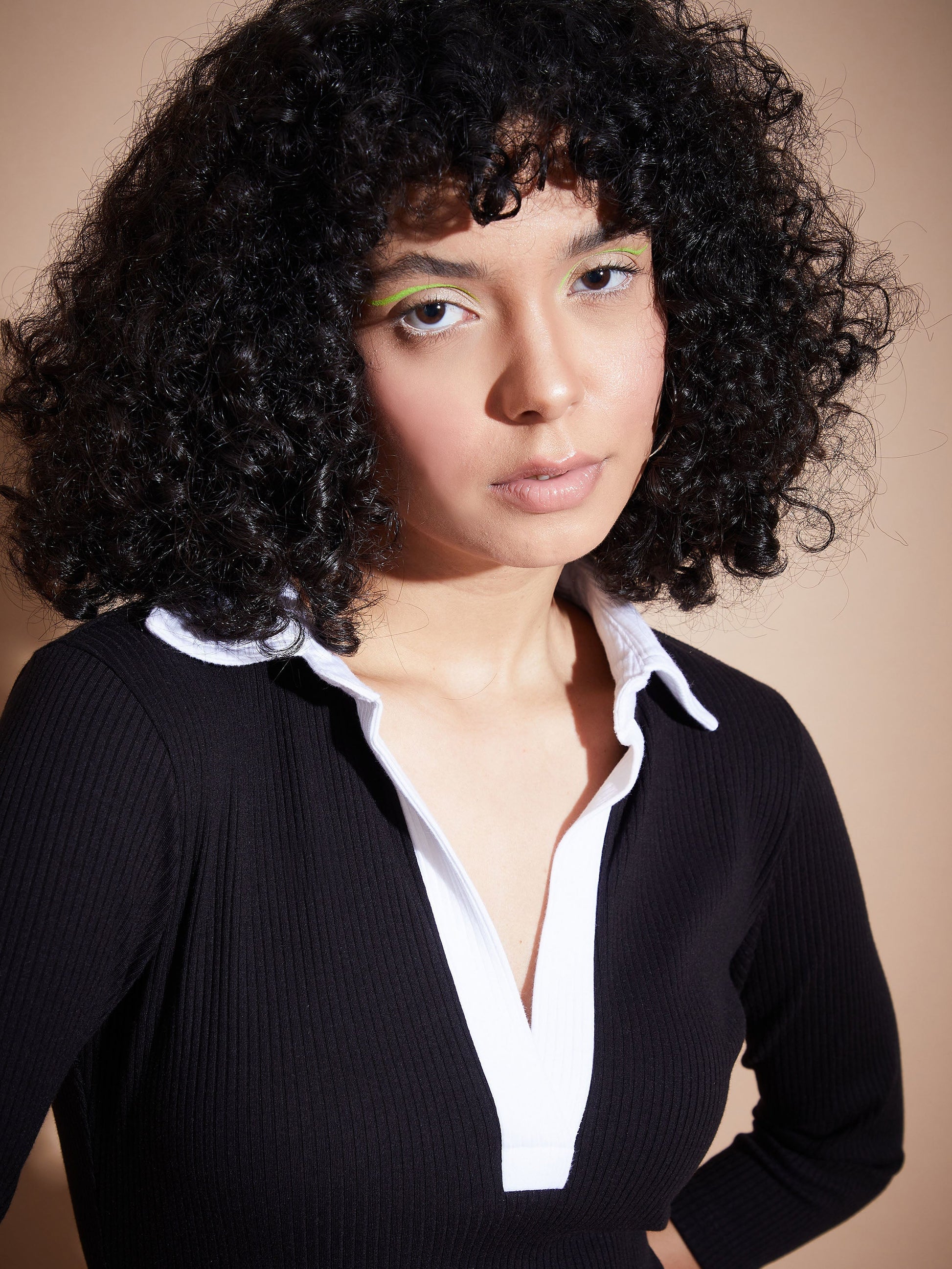 Women Black Rib Contrast Collar Midi Dress
