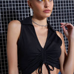 Black Rib Front Rouched Tank Top , in Rib fabric, Casual , Crop Length, No Closue, Unlined , Dori Detail At Front Hemline and features NA
