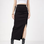 Black Rib Front Ruched Midi Skirt, in Rib fabric, Unlined, Below Knee, Slim Fit, Slip-On, Straight Hemline and features Slit At Back